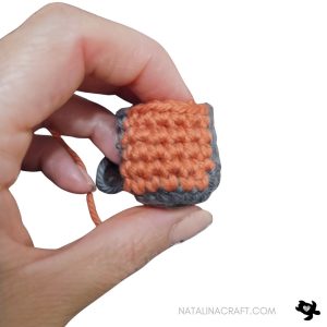 - Rounds 4 to 7: 1 sc in the next 6 st; change for the dark orange yarn: 1 sc in the next 6 st; change back to the grey yarn: 1 sc in the next 6 st. (18)
