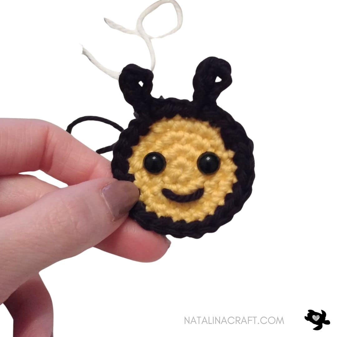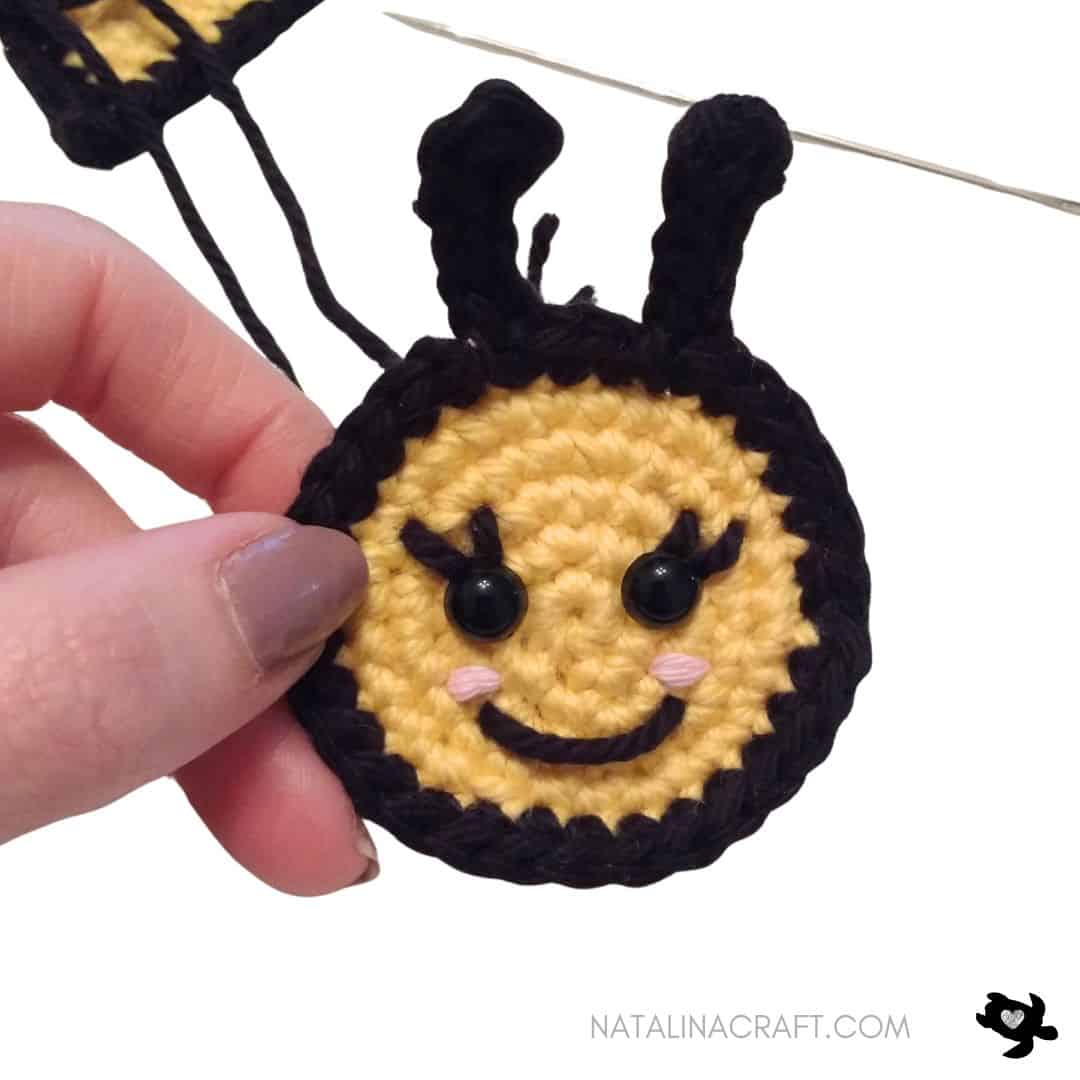 • Small bee: Eyes between Rounds 2–3, embroider a simple mouth.