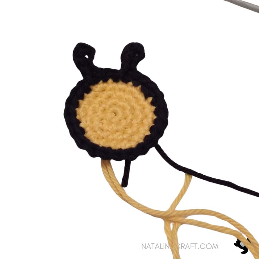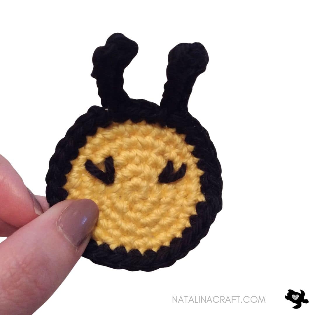 • Male bee: Eyes between Rounds 2–3, spaced 3 stitches apart. Embroider eyebrows and mouth.