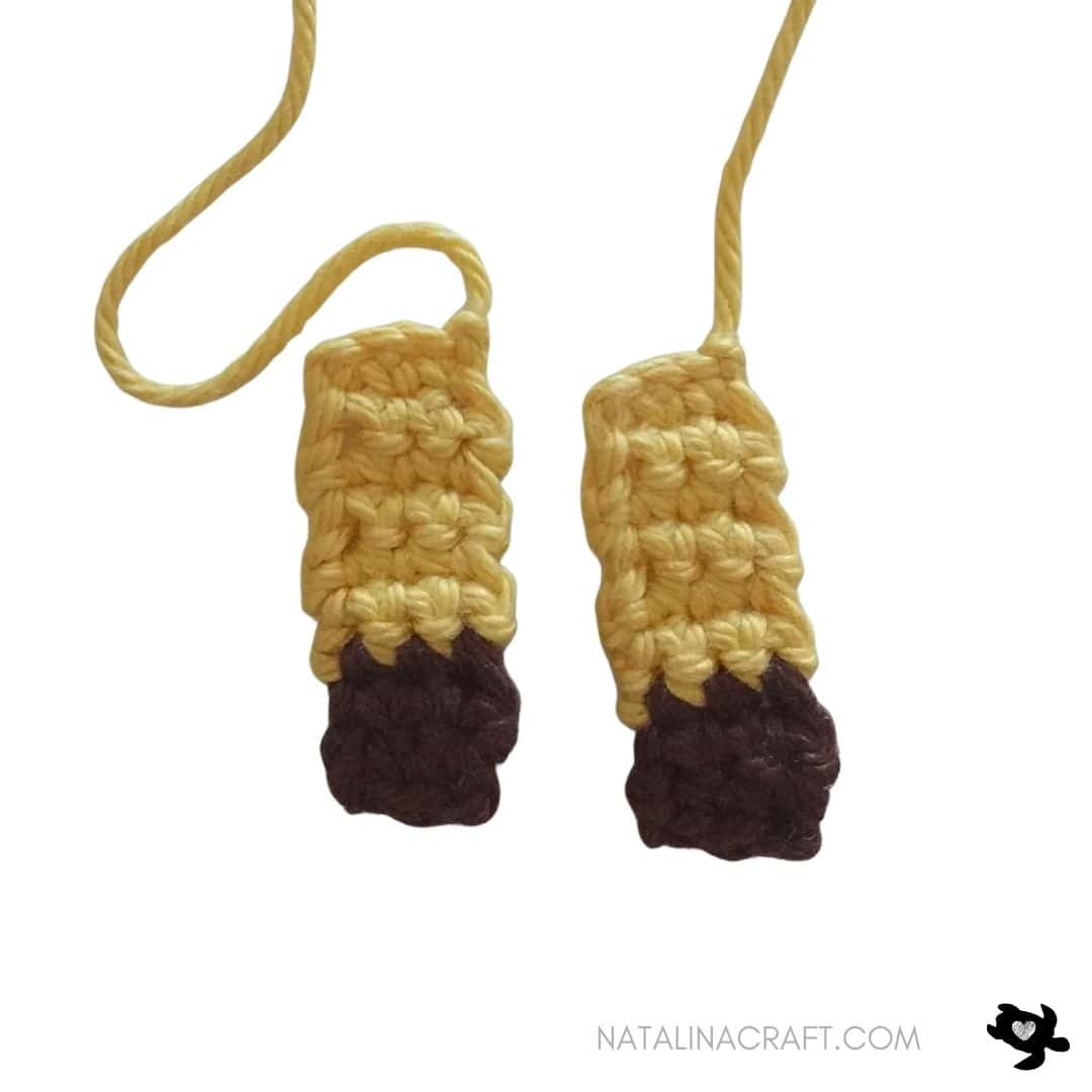 ch 10.Cut two strands of brown yarn, fold in half, and attach to the last chain with a lark’s head knot (Insert your hook into the last chain, fold the two brown strands in half, and pull the folded loop through the chain. Using your fingers, pass all the yarn ends through the loop and gently tighten to secure). Trim and separate strands for a natural look.