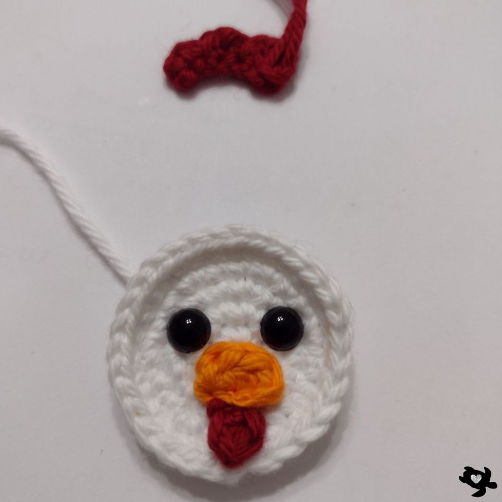Fasten off, leaving a long tail.Sew the wattle directly below the beak.