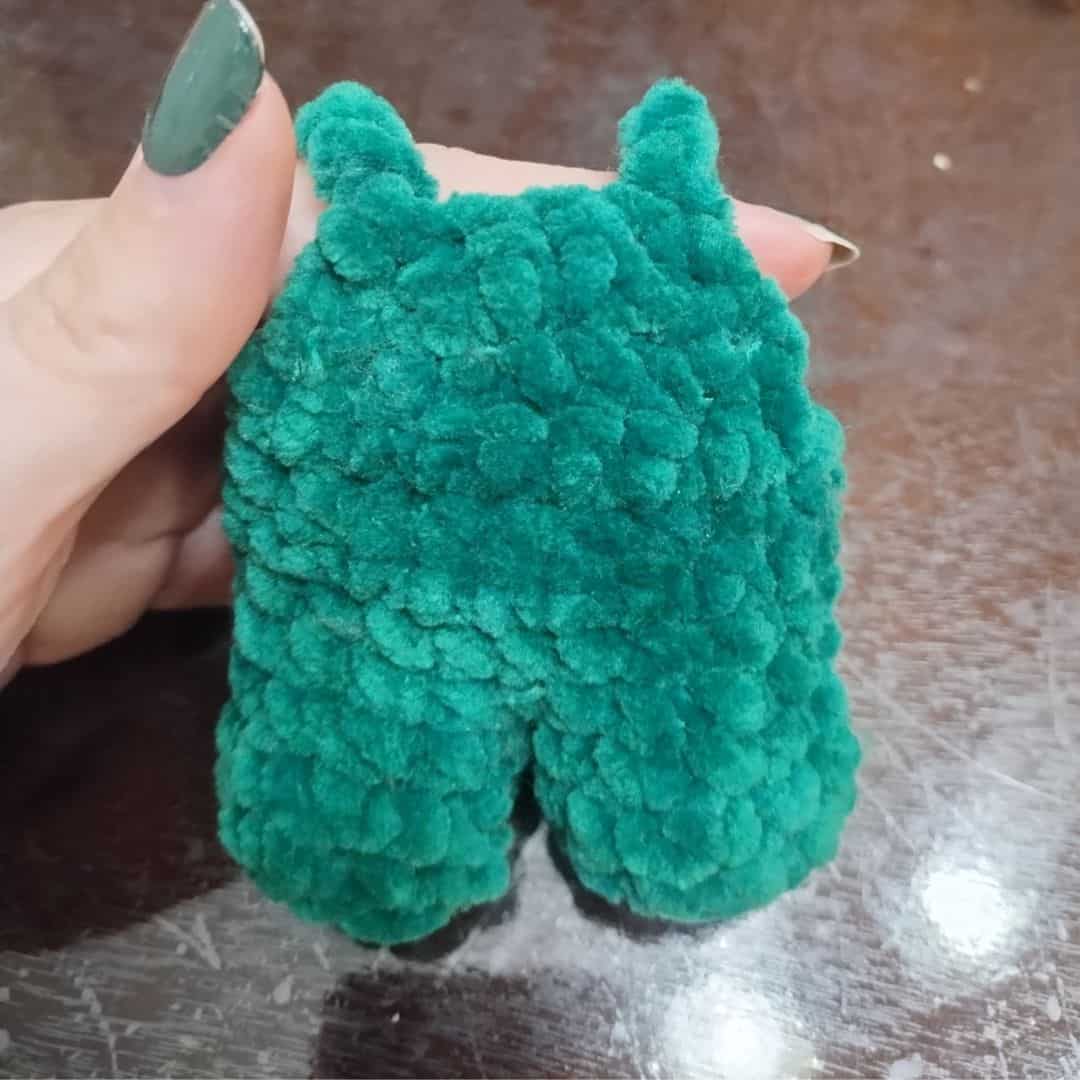 • Tour 5 : Continuer depuis la Patte 2, faites 2 ml. En travaillant dans la Patte 1 : 1 ms dans chacune des 6 m. Ensuite, travaillez 2 ms dans l’espace des 2 mailles en l’air (une dans chaque brin de la chaĂ®nette). Enfin, 1 ms dans chacune des 6 m autour de la Patte 2. (16)