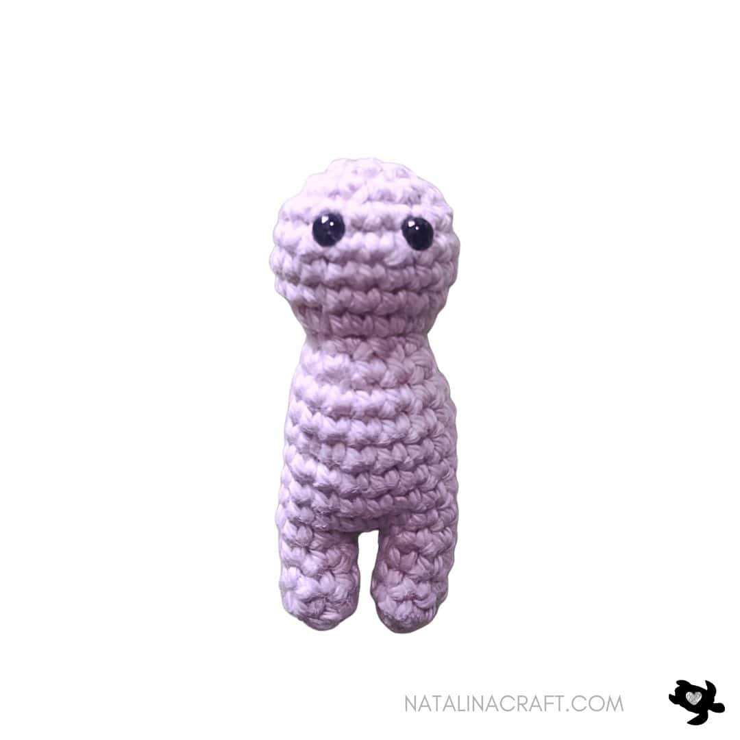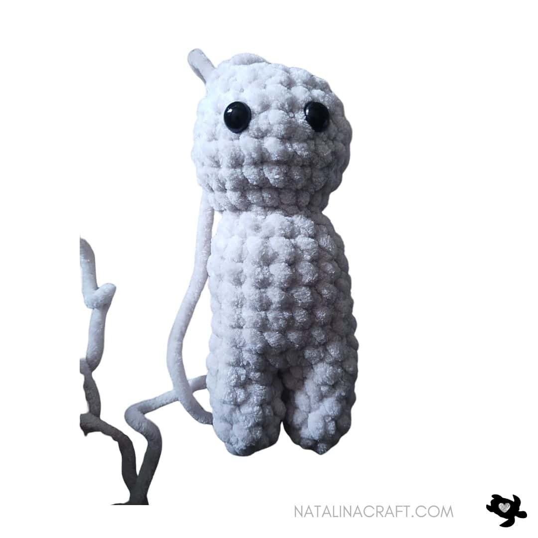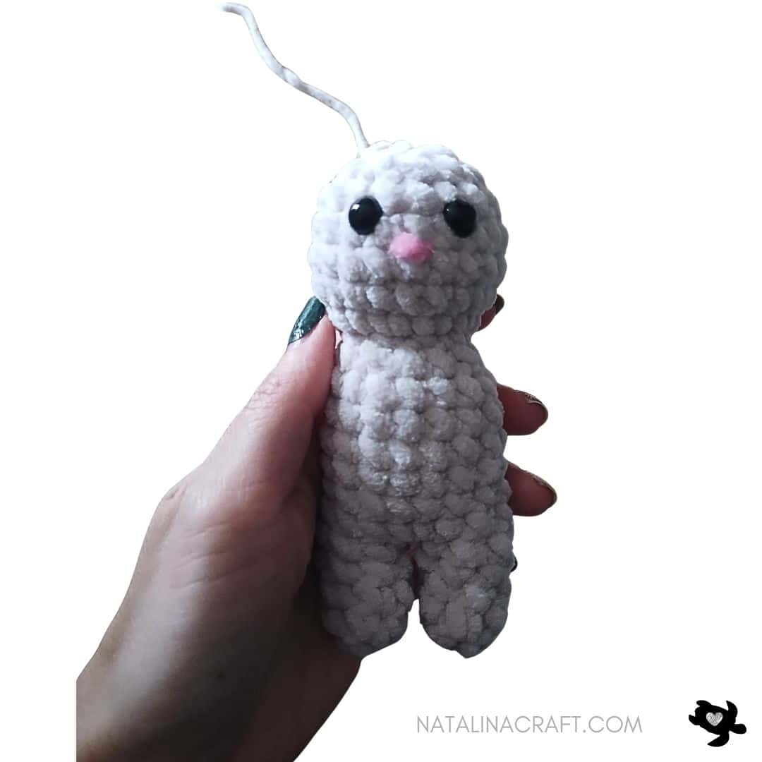 Placer les yeux entre les Tours 17 et 18, espacés de 2 mailles. Avec une aiguille à laine et le fil rose, broder un petit nez sur 1 maille entre les Tours 16 et 17, centré sous les yeux.