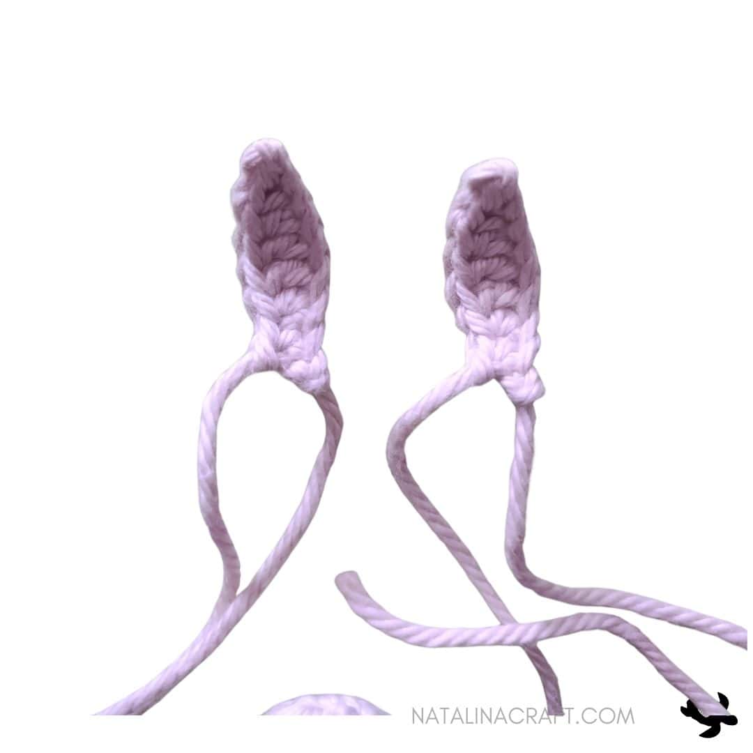 Rembourrer. Arrêter le fil et fermer. Coudre les oreilles sur la tête au niveau du Tour 19 et 20.
