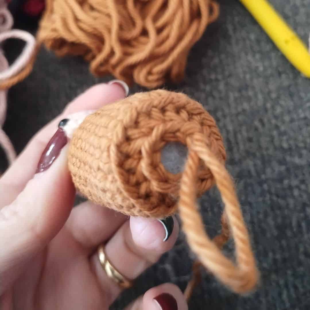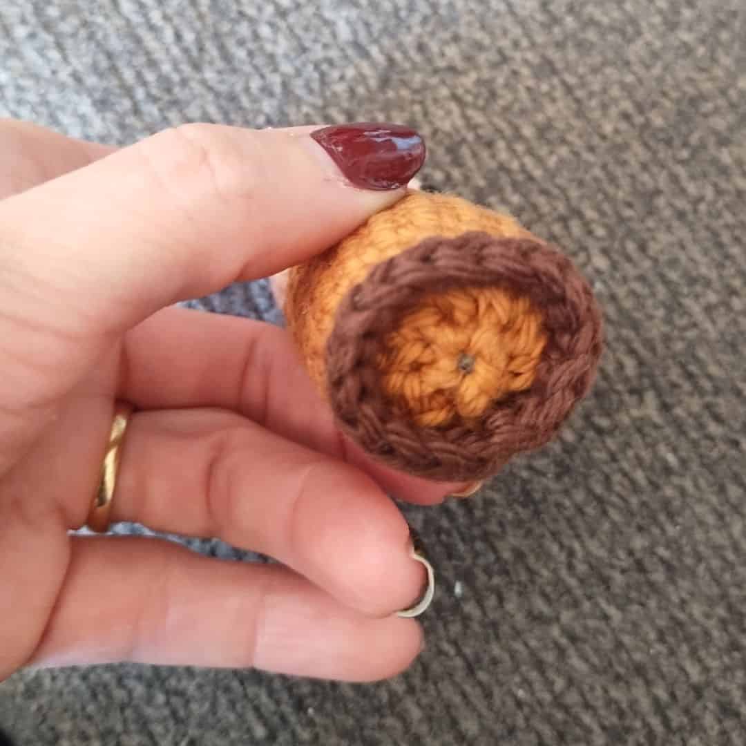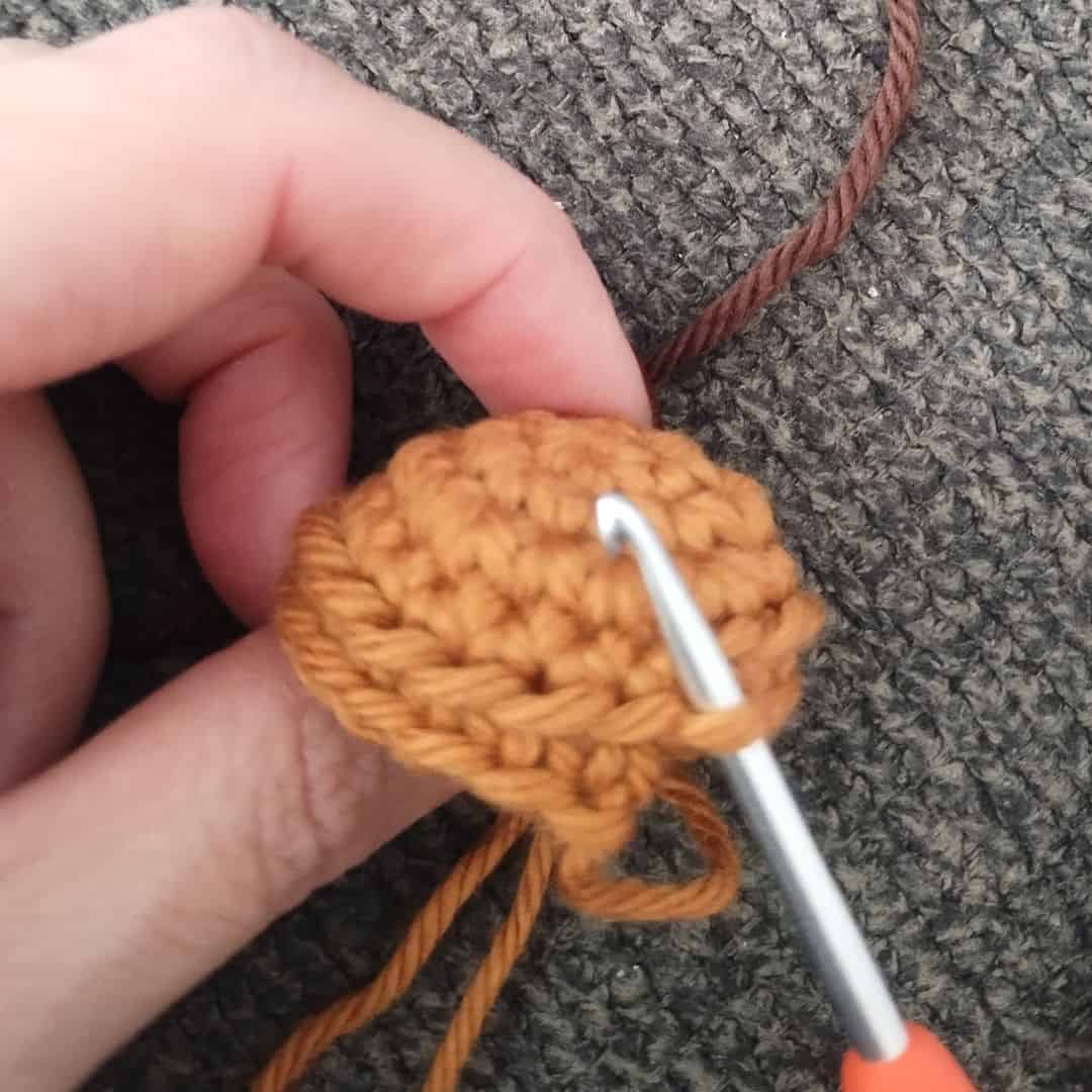 Join the dark brown yarn in any front loop stitches of Round 19 (I joined in the back to make it less visible).
