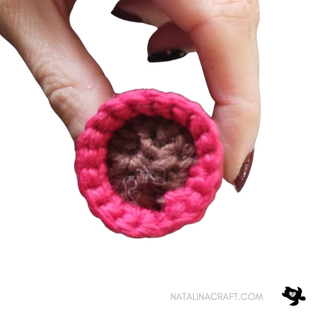 To make the muzzle, cut one large light brown circle (about 3/8″) and one small red circle (about 7/32″) from felt sheets. You can use a hollow punch set or scissors. Glue the small red circle (nose) onto the brown circle (muzzle). Then glue the finished muzzle to the reindeer’s face over Rounds 6 and 7.