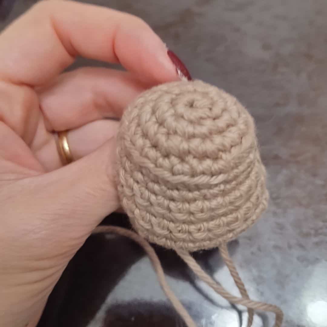 Close the body: Using a tapestry needle, weave the yarn tail through the front loops of all 9 stitches and pull gently to close the opening. Secure the yarn and weave in the end.