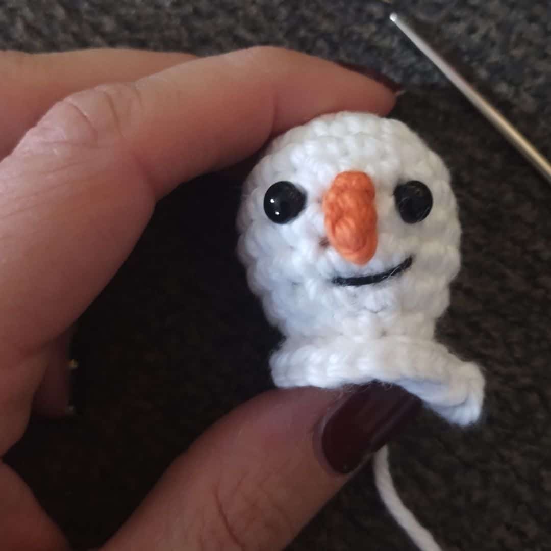 Cut the yarn and fasten off. Place around the neck of your snowman.