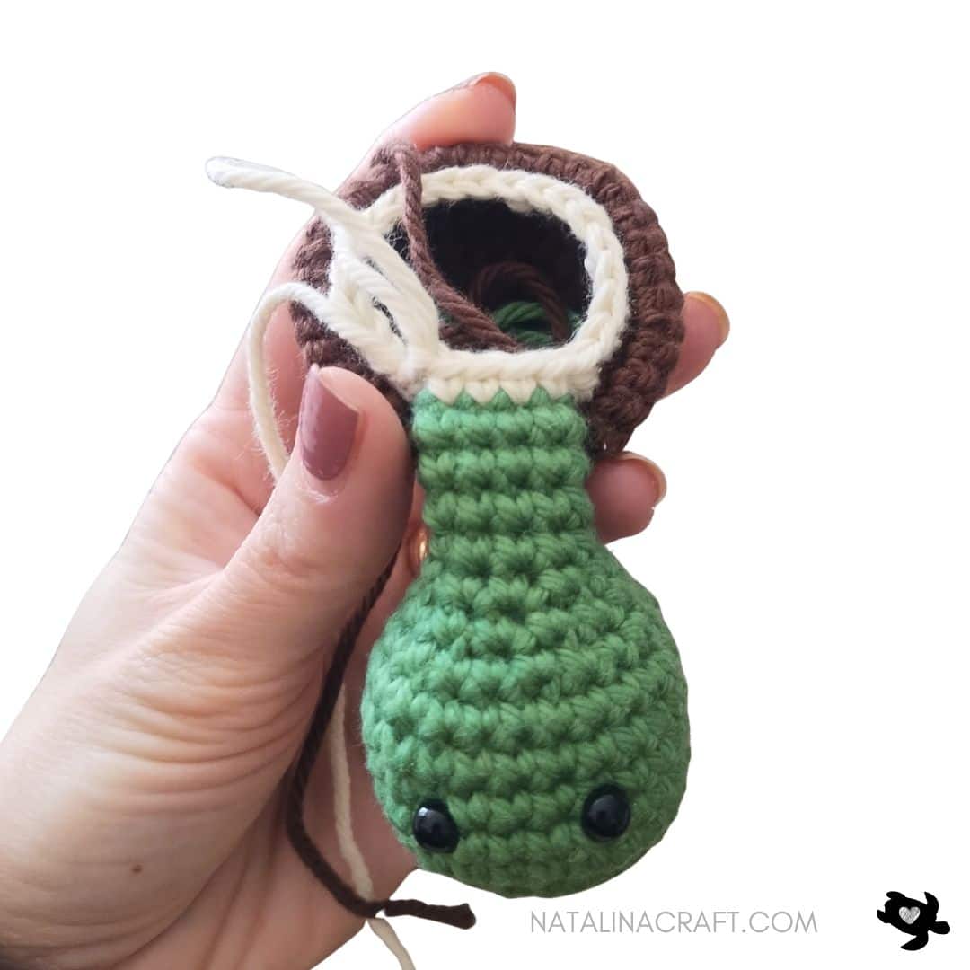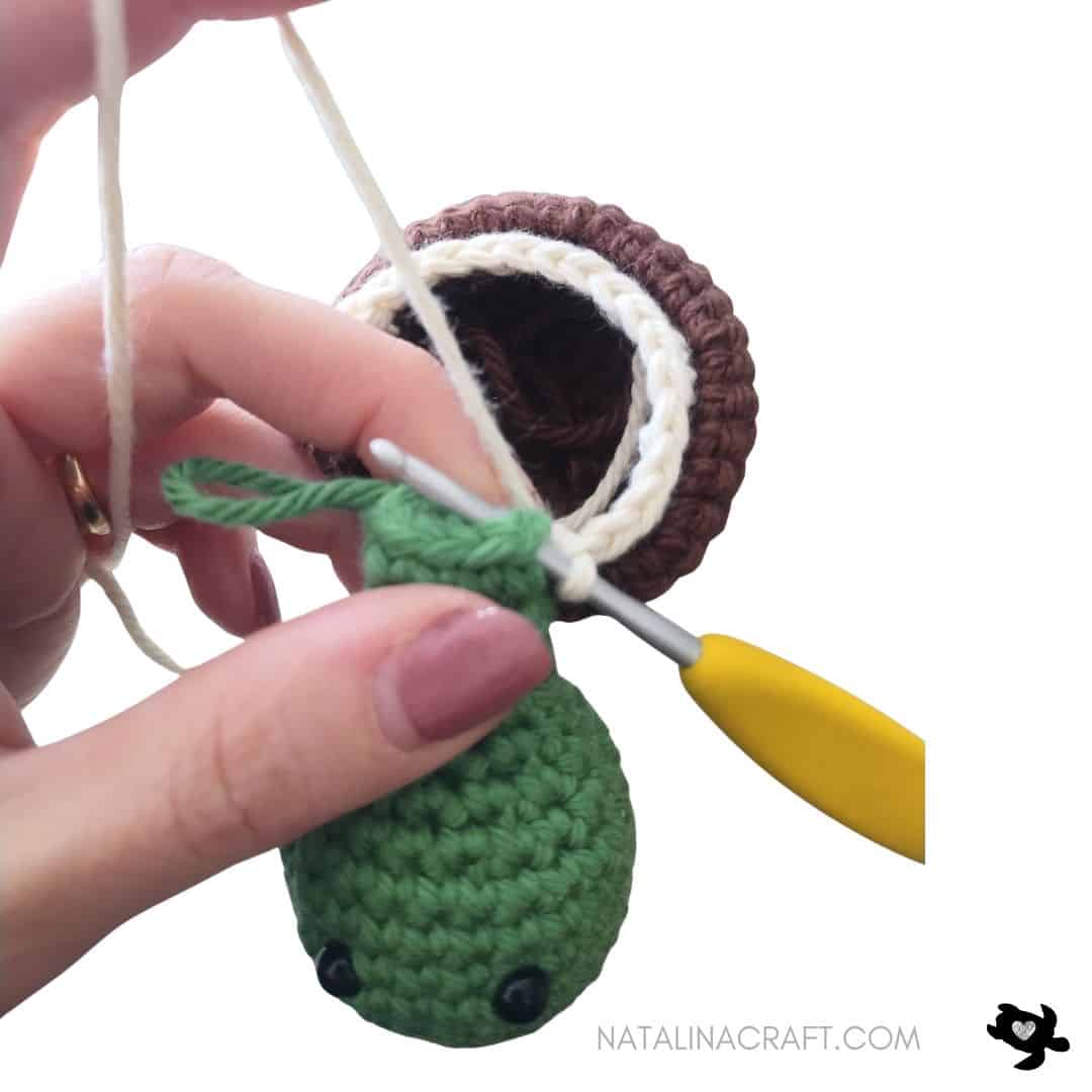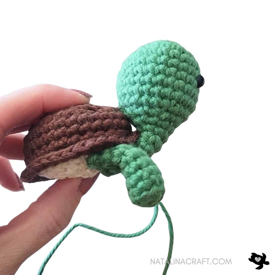 - Round 1:(4 sc, 1 dec) × 2Leave 5 stitches unworked at the front opening.Attach the head by working 4 sc evenly through the stitches of Round 16 of the neck (front of the neck).Continue around shell: (4 sc, 1 dec) × 3. (24)