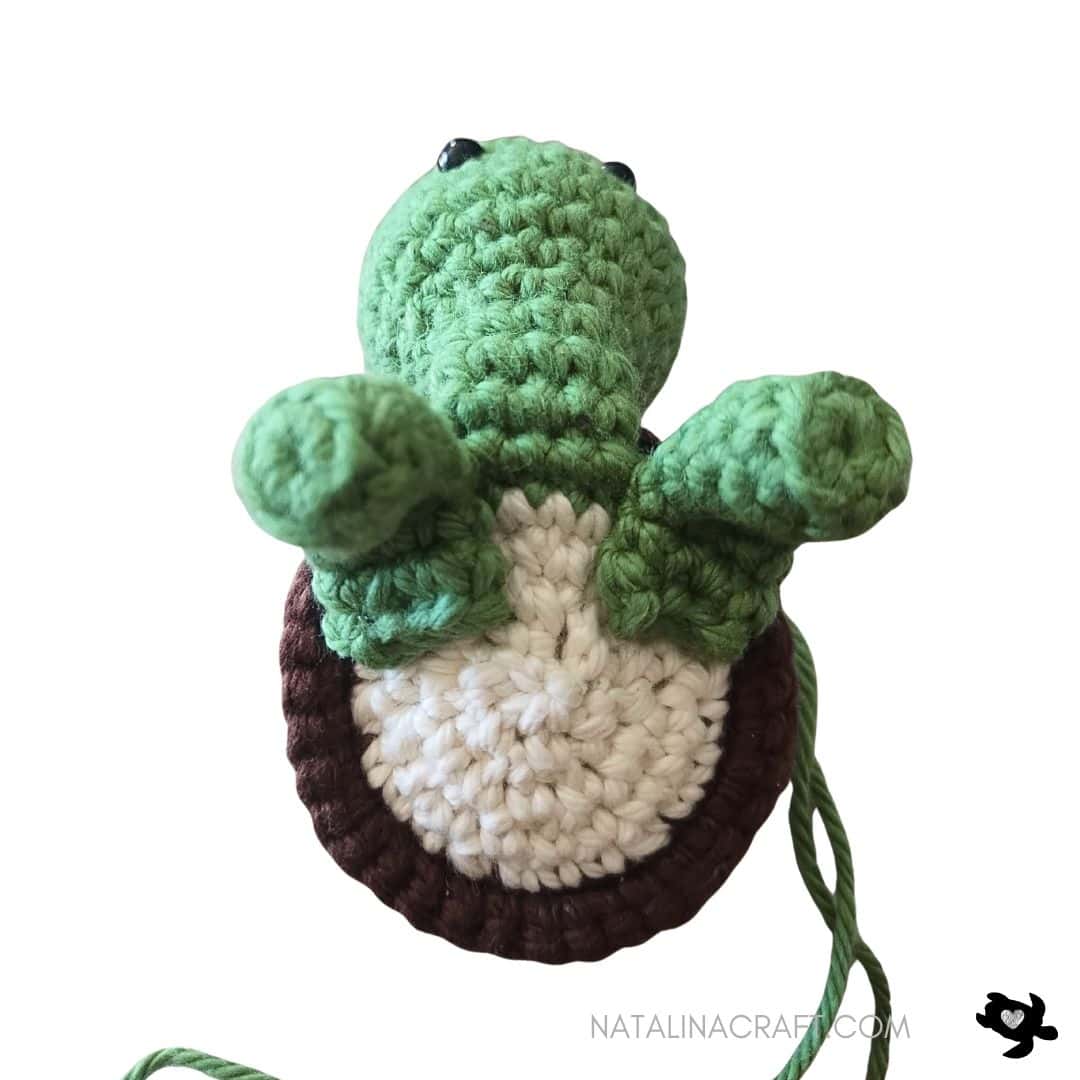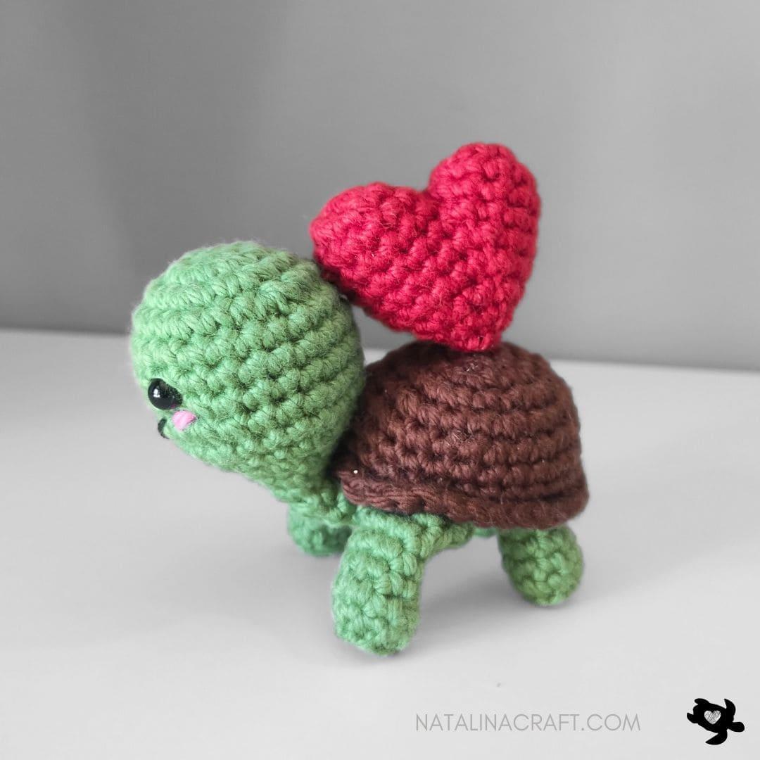 Stuff, close the opening, and fasten off. Sew the heart between the tortoise’s shell. I sewed the bottom of the heart to the shell and one side of the heart to the head.