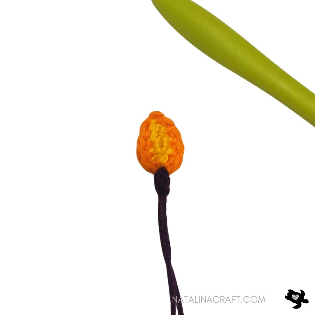 Fasten off, leaving a long tail for sewing.Insert the yarn tail into the stitch of Round 2 where you joined the black thread, then use a tapestry needle to weave the yarn down through the center of the flame to the bottom of the wick.