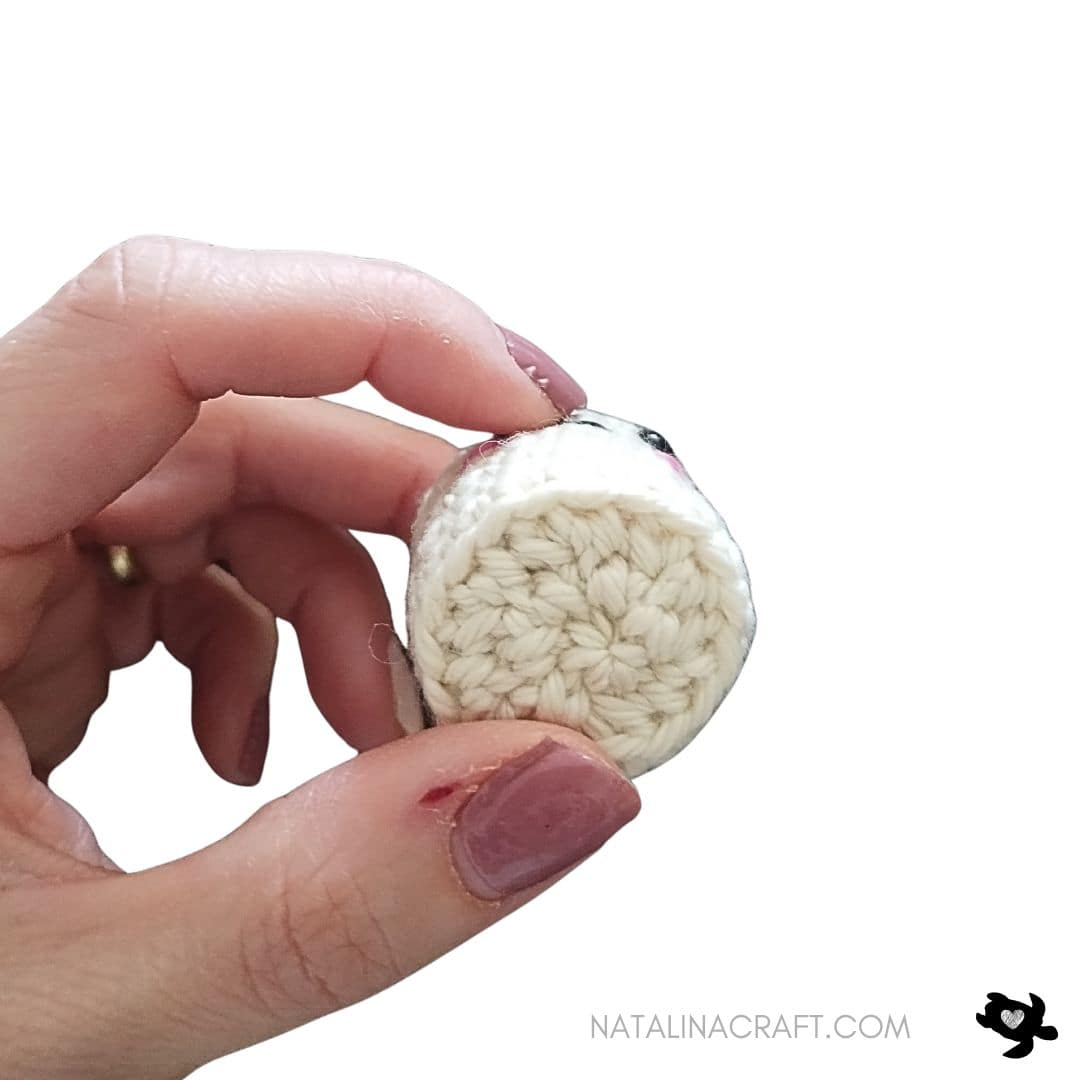 Place the safety eyes between Rounds 5 and 6, spaced by 2 stitches.Using two strands of pink yarn, embroider small cheeks between Rounds 6 and 7, over one stitch, just below the eyes.With black cotton thread, embroider a small mouth over Round 6.