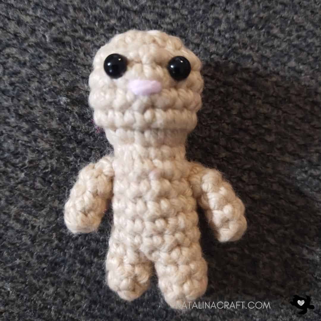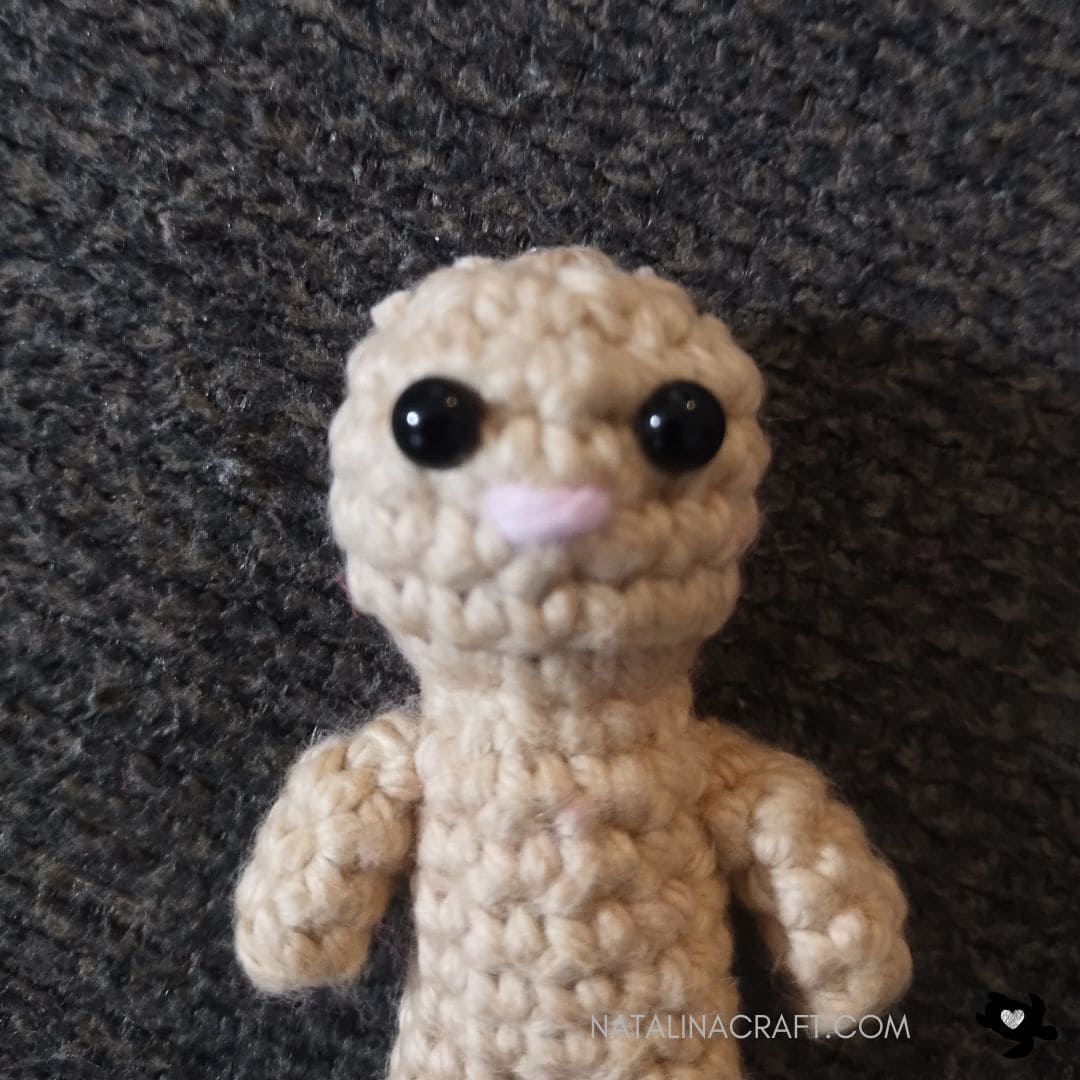 With your tapestry needle and pink yarn, stitch a little nose over 1 stitch between Rounds 13 and 14, centered below the eyes.