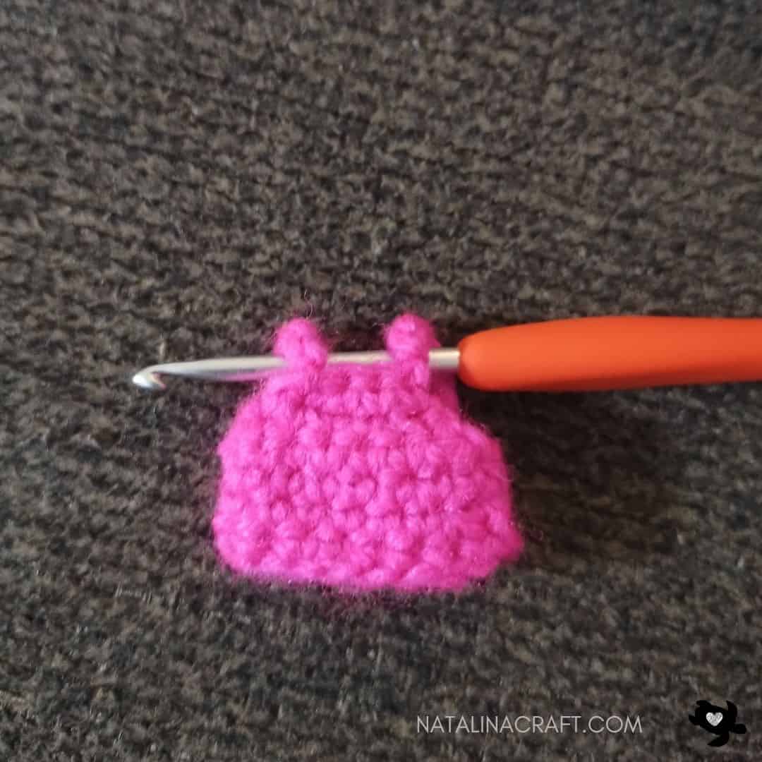 - Row 5: ch1, turn: [1 dec, 1 sc in the next 2 st]. (6)