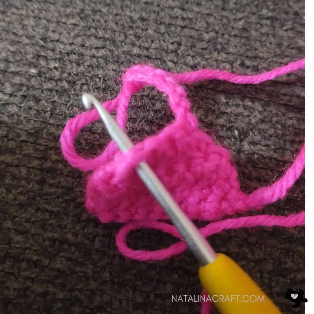 - Row 1: starting in the 2nd ch from the hook: 1 sc, 3 hdc, 1 sc. (5)