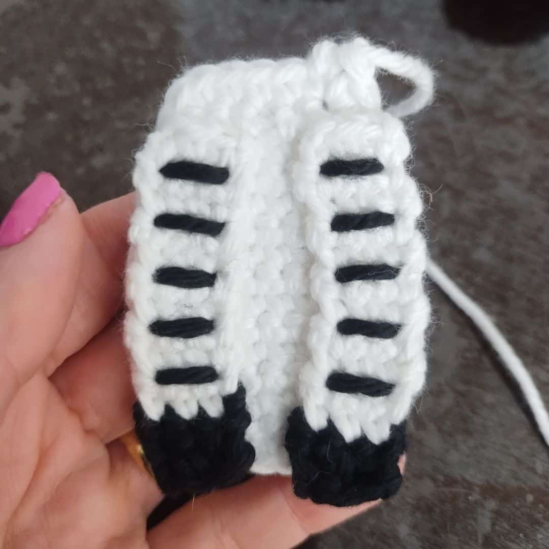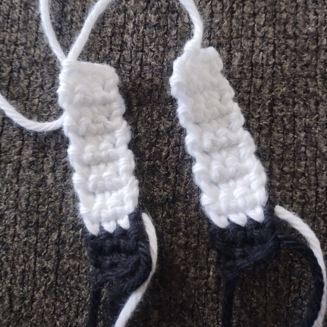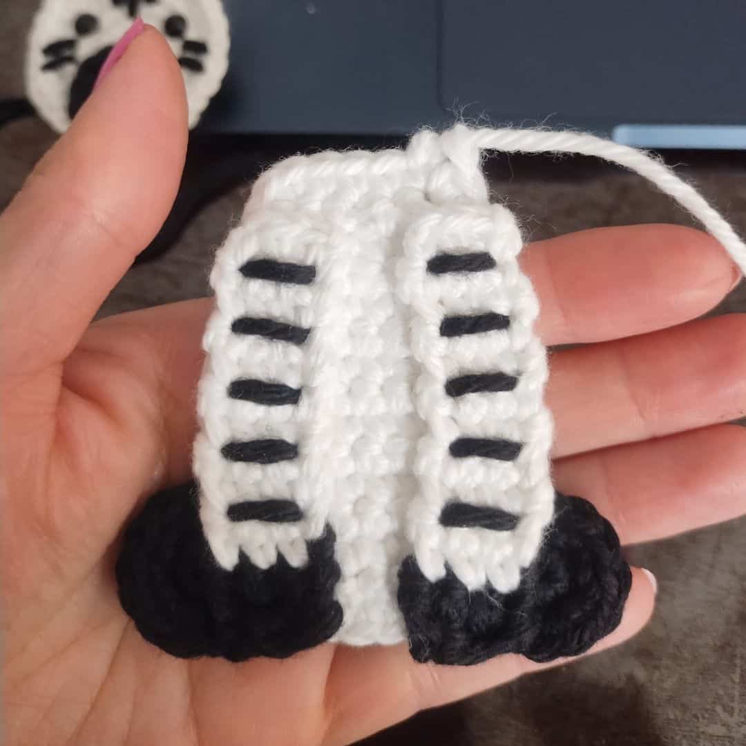 Cut the yarn (leave a long tail for sewing) and fasten off. With your tapestry needle, sew the back legs behind the body (I used a little piece of white yarn to sew them). Position them so only the “foot” (the rounded part) is visible from the front.