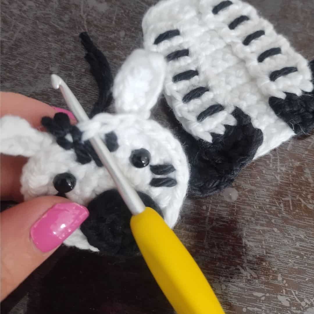 Cut the yarn (leave a long tail for sewing) and fasten off. With your tapestry needle, sew the muzzle to the head. See the pictures below.